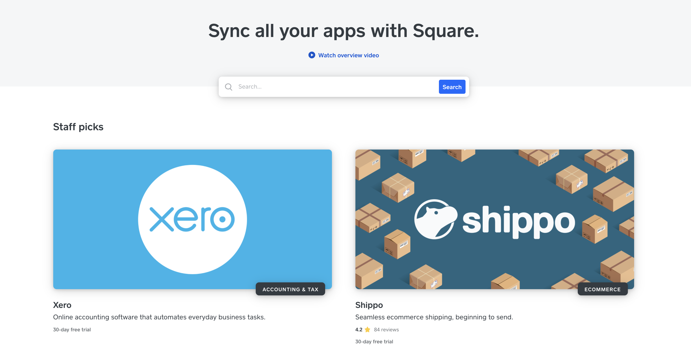 The first one is the Square App Market Place where you can find all current integrations that third party companies or developers have created to use Square with their Services.