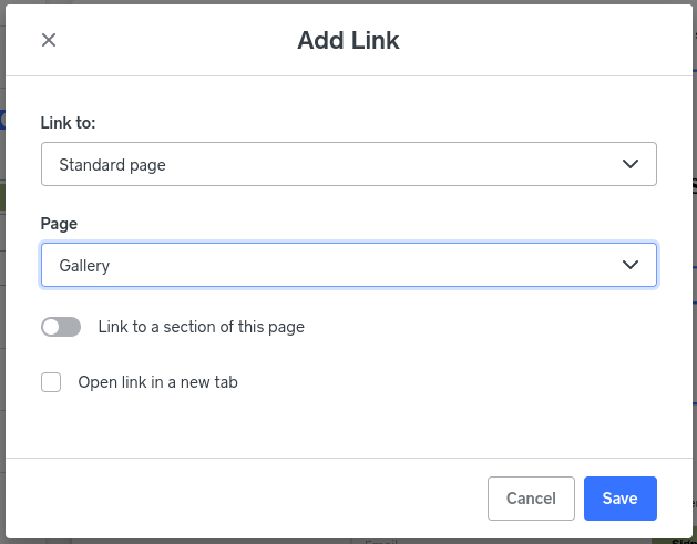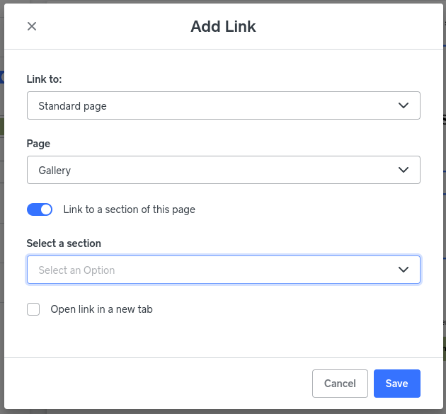 You'll want to toggle that ON to specify a section of the page - once you do, the section selector drop-down menu will appear. You can also check the box at the bottom of the pop-up window if you'd like these links to open up in a new tab when your visitors click them.