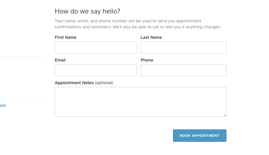 As of right now, when clients book online with your Online Booking Site, they'll be required to enter their name and contact information at the "How do we say hello?" Screen.