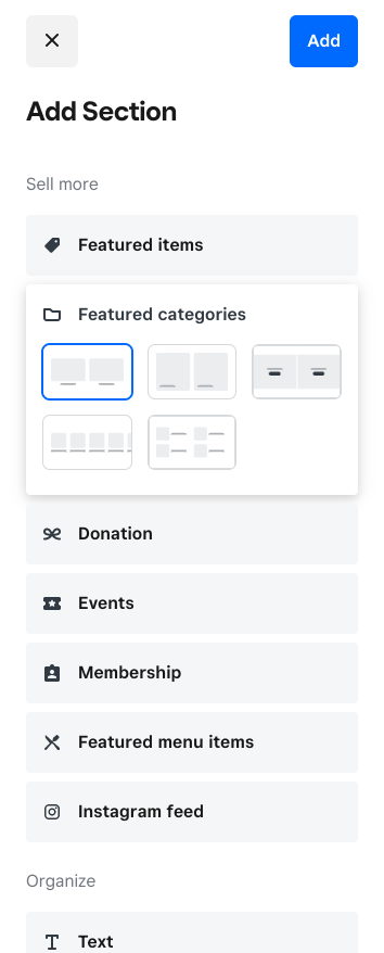 I'm happy to help answer this for you. From your website editor, go to Home and then Add Section (as shown below). From here, select Featured Categories and select the item categories you'd like to feature on your home page.