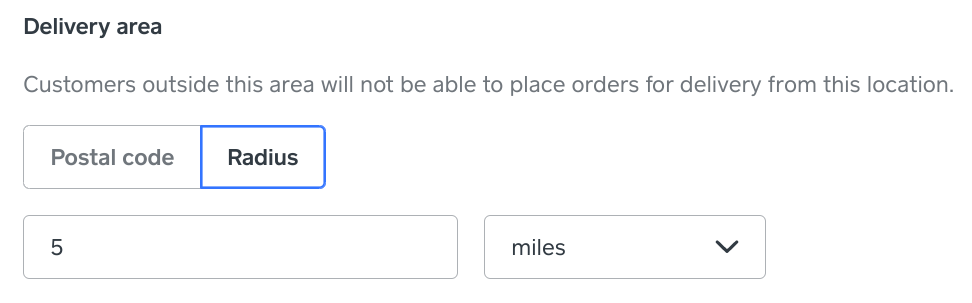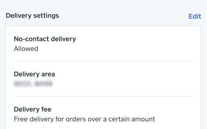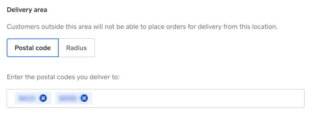 Click into this section to edit your delivery settings. You'll see one of two things underneath the section titled Delivery area - you've either selected to define your delivery area by ZIP code(s) or by radius: