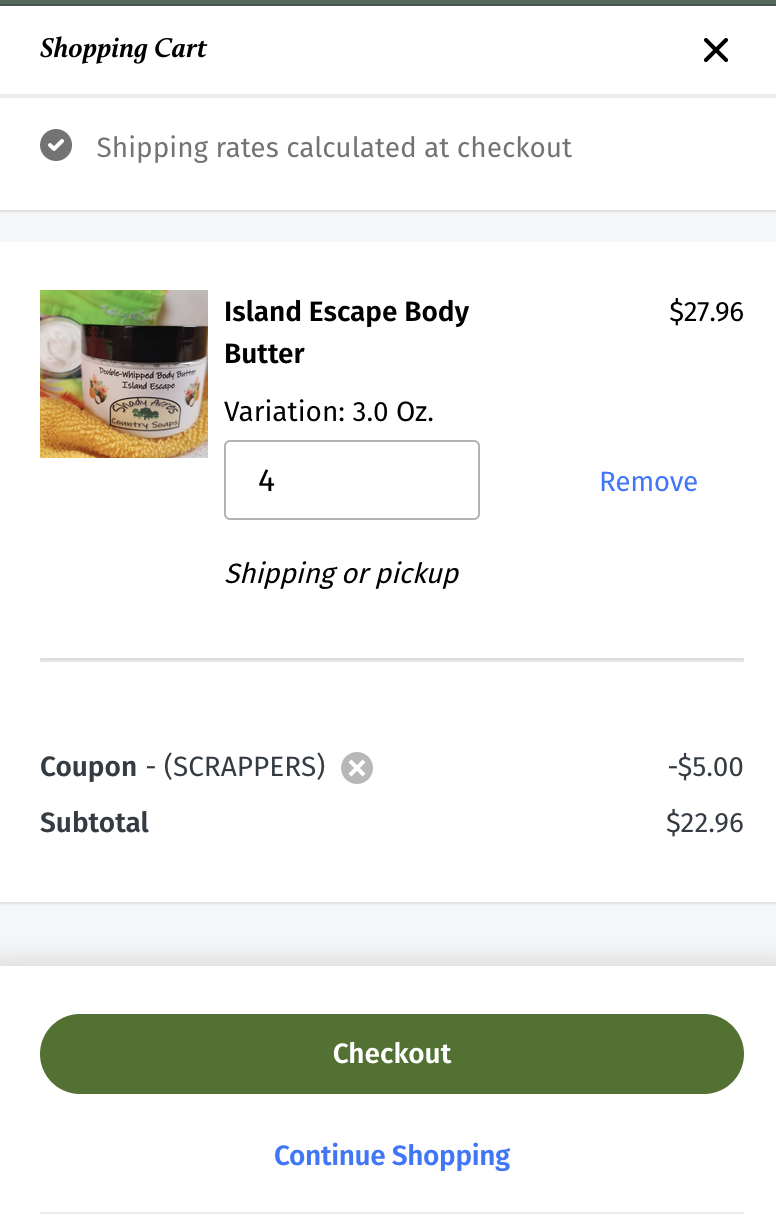 Thanks for looking into this. Yes, I see the same thing that you see until I click the CHECKOUT button and then the message displays right under the Coupon SCRAPPERS box that reads "Your current order does not yet qualify for coupon SCRAPPERS" The coupon is being applied.