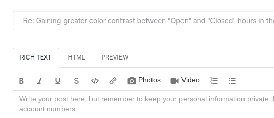 Is there any way to set a greater color contrast between "Open" and "Closed" hours in the Square Calendar? I can't see the difference, at a glance, between the two in the calendar, especially on my phone. Even on my computer screen I have difficulty seeing where the lines are vs. the solid blocks. The appointments themselves show up brilliantly, but not my schedulable times vs. non-schedulable times in between.
