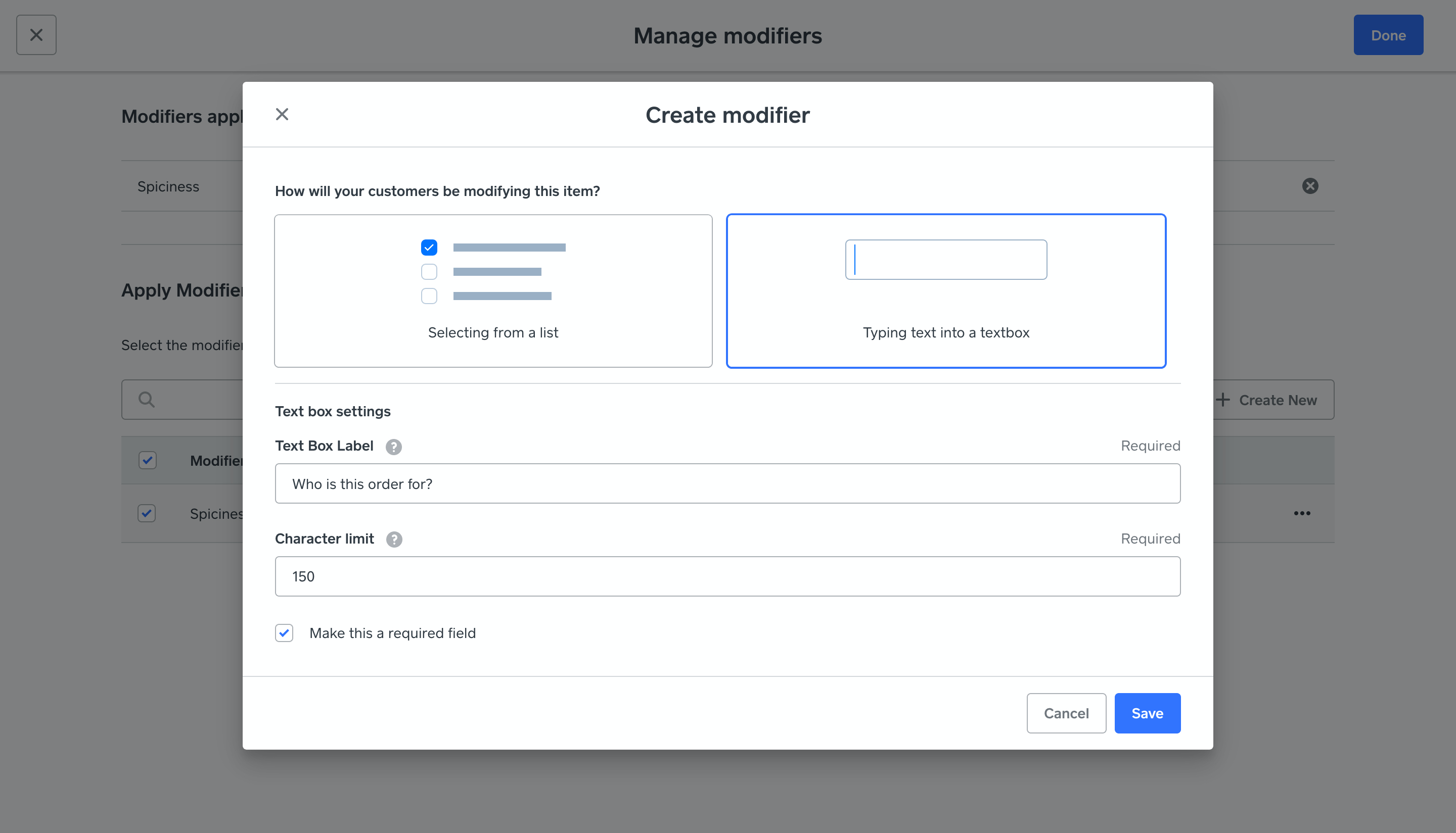 From the Square Online dashboard, click Items > Site Items, then select an item you wish to edit. Scroll down to the Modifiers section and click Manage Modifiers. You will be able to create a new modifier on this screen (where you will see the text box option) or you can select an already created modifier.