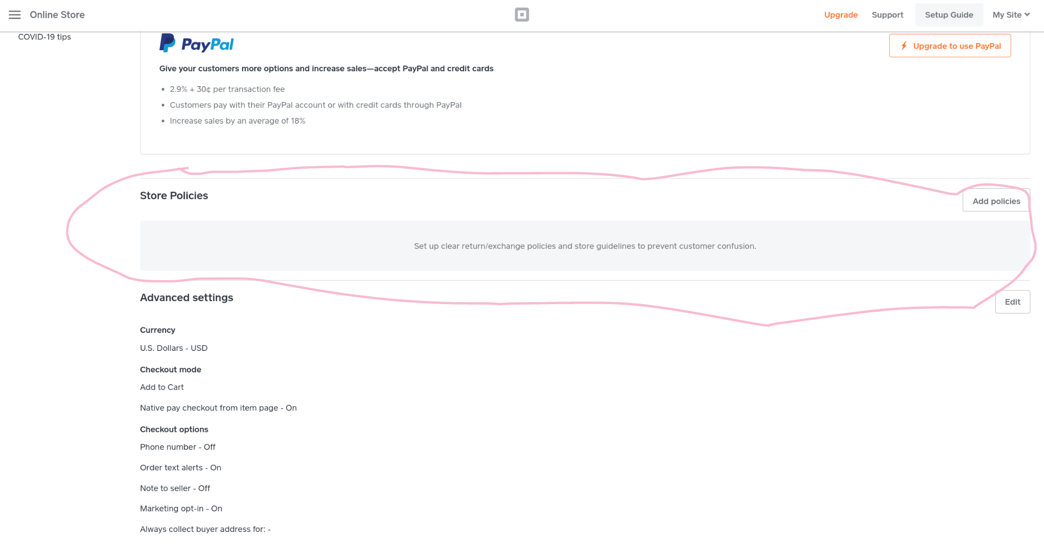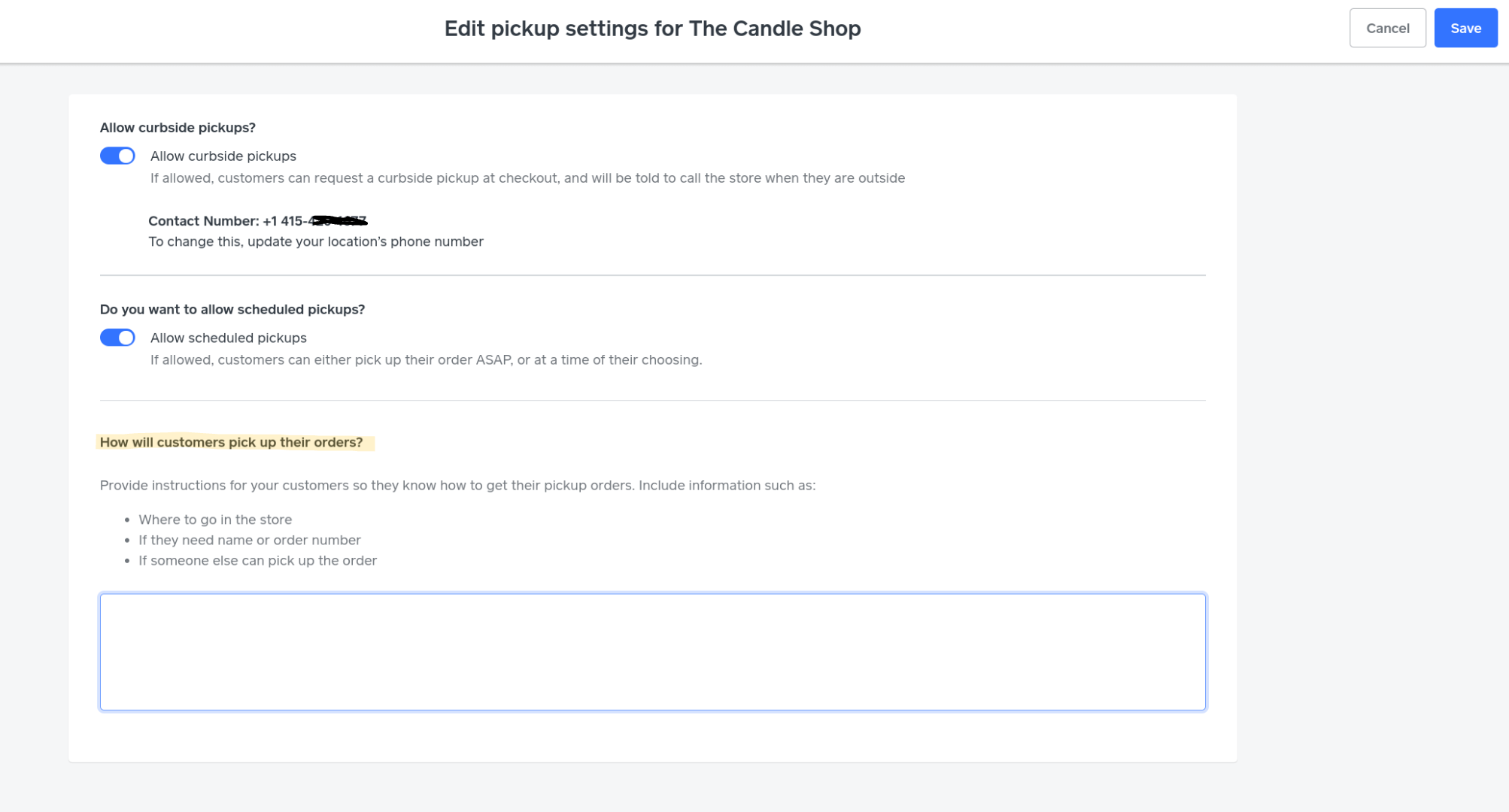 For Pickup & Delivery settings, you can provide instructions for your customers so they know how to get their pickup orders: