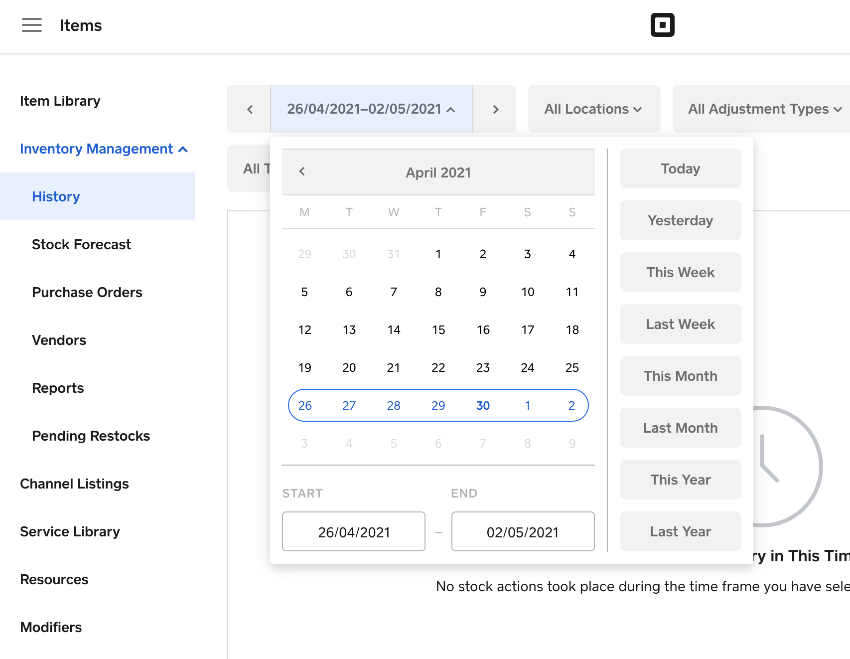 If you have Square for Retail: Inventory Plus, when you manually adjust your stock, accept a purchase order, or make a sale, your History log will reflect each adjustment. Your History log is intended to give you a detailed account of your current inventory levels by listing out each stock adjustment. It will also let you select a specific timeframe: