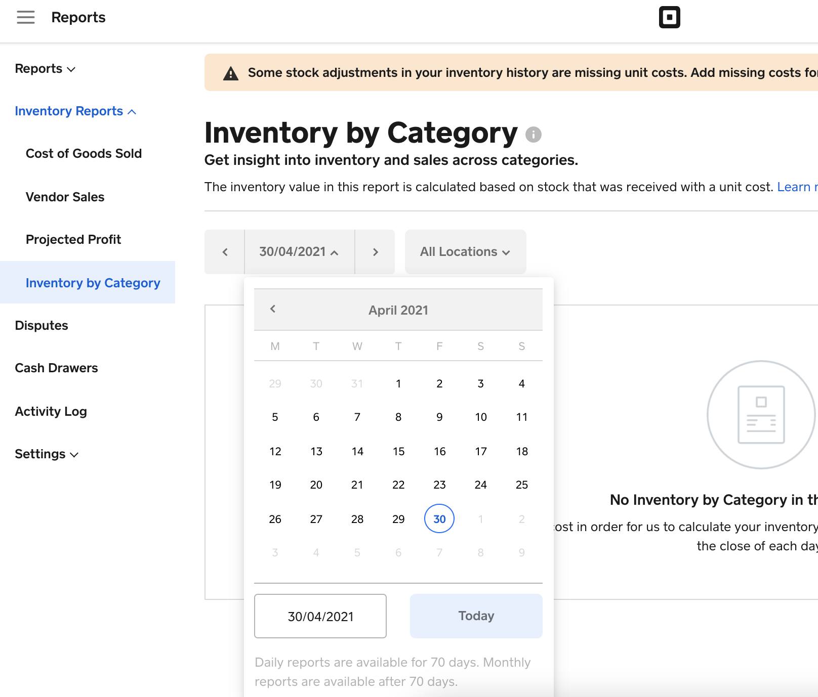 Plus also comes with an Inventory by Category report - which will allow you to view inventory by category on each day for the last 70 days: