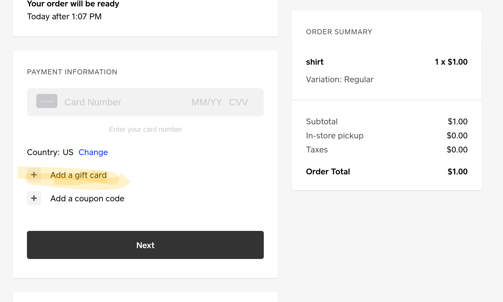 @egift Under the Payment Information section at checkout: