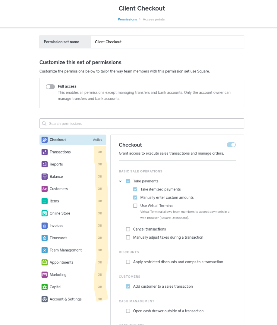 You can create the permission set in the Team section of the Online Dashboard. You could name the set "client checkout," and turn everything but checkout off: