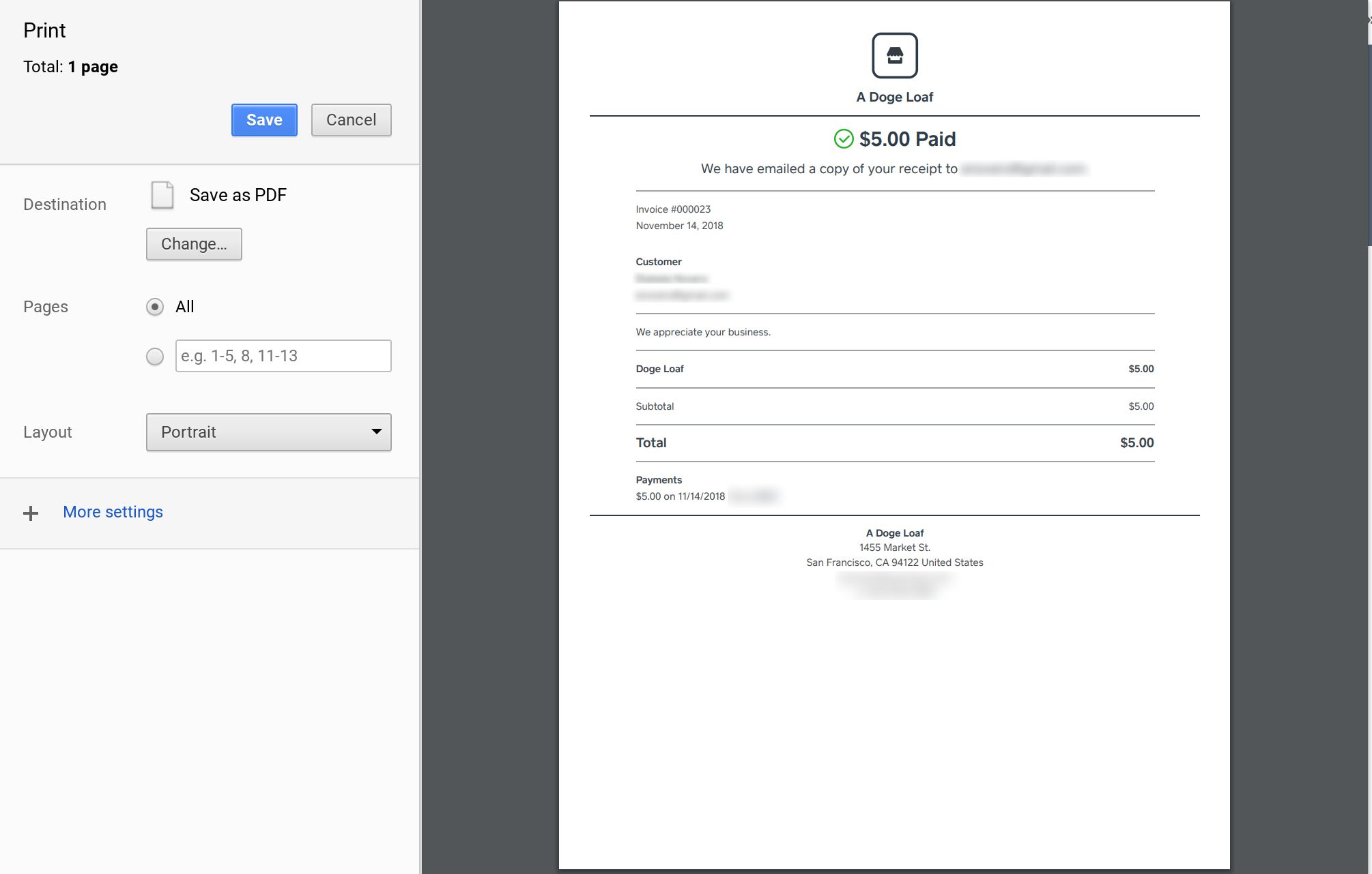 Hey @onesource - Currently, there isn't a way to send an Invoice as a PDF directly within the app. It would need to be sent as an attachment. If the reason you are looking to send a PDF is because you or your customer are concerned about the format of the printed invoice, there is the option to print directly from the "Pay Invoice" page after payment has been taken and it will look just like the PDF version. (see below)