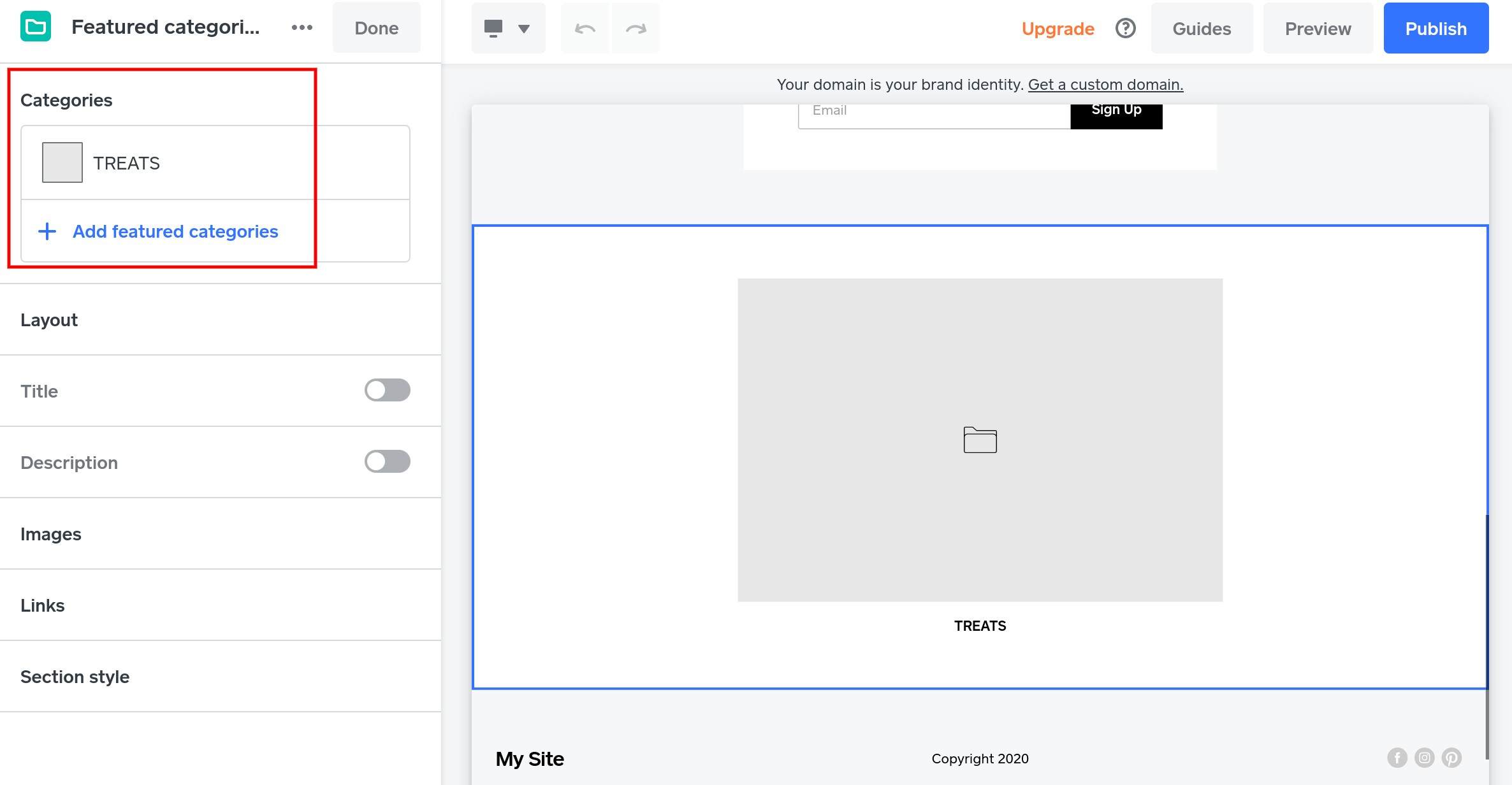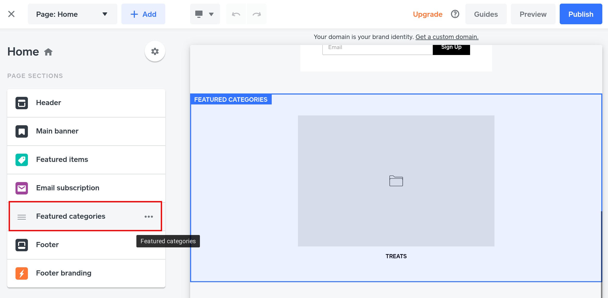 First, you'll want to be in your Website Editor mode. Once you're there on the home page, to the left you'll see a tab that says Featured Categories. Click there. You'll then hover over the plus button that says Add featured categories. Those categories don't sync from Square, so you'll need to create them through this step. You can choose to have just one or multiple categories showcased on your homepage with an image.