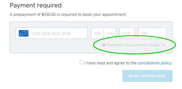 First of all, when you require a client to prepay for their Appointment at the time of booking they will see a message stating their card information is Protected and Encrypted by Square Inc.:
