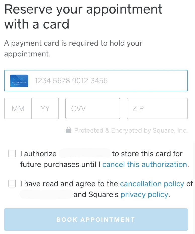 When you turn on No-Show protection, your customer is required to link a card to the appointment, and also has the option to store the card to their profile as a Card on File. If a customer is booking their own appointment, they will only be able to do so by linking a card directly to the appointment. Your customers will not be able to make an appointment on their own without attaching a card to the appointment itself. This is what your customers will see when booking an appointment: