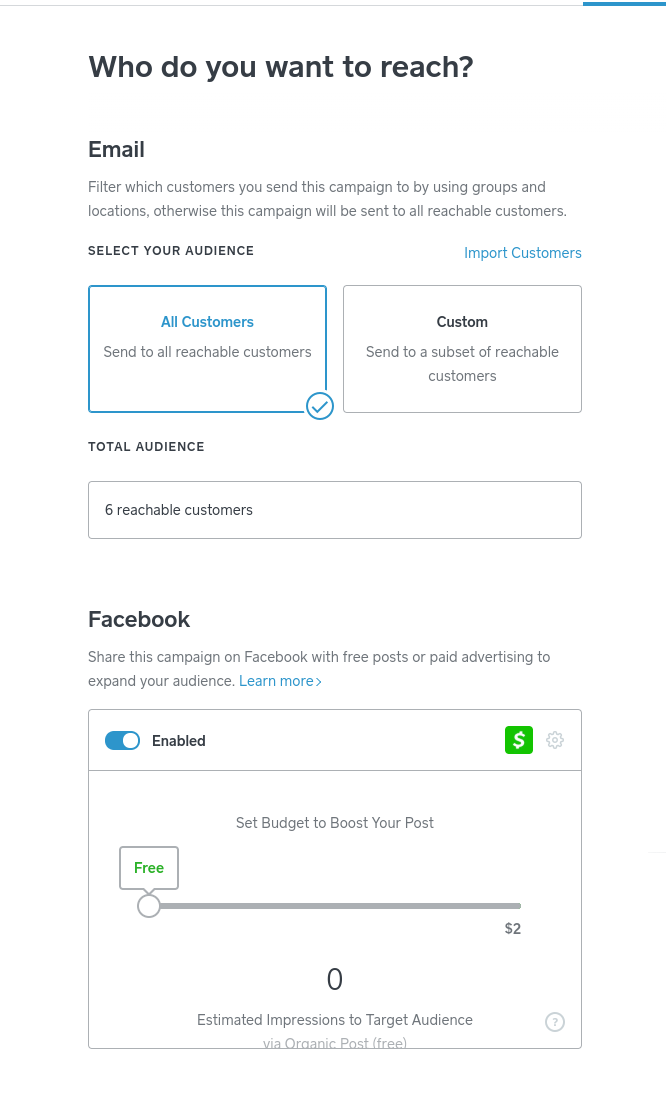 After enabling the toggle you should be prompted to connect your Facebook account. Once you complete the prompts you'll be redirected to your Square Dashboard and it will look similar to the image below.