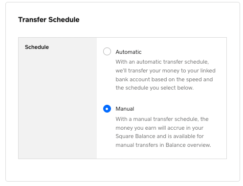 Important: if you have an active Square Checking account, your transfers will remain Manual and will only be transferred into your bank account upon your request.