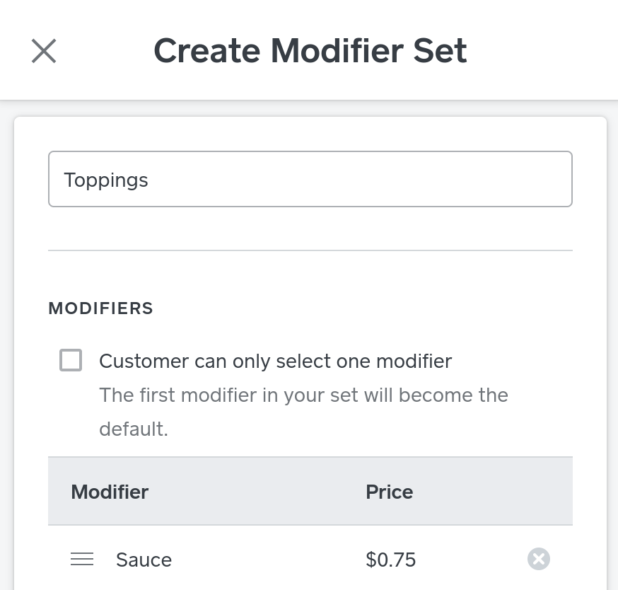 Modifiers are better for sauces and other toppings, so that's what I'd recommend for your Gizmos here - this will keep all your Gizmos coming from the same inventory. You'll start by making sure that you have your Gizmo priced at $4. Then you'll want to head here, and select Create a Modifier Set; I'd recommend adding your sauce here as a $0.75 charge.