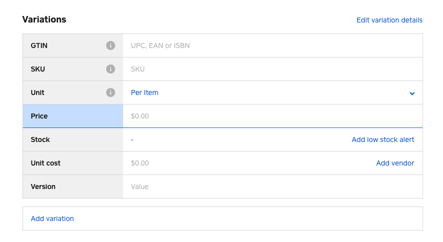 To add a price to an item, simply enter one in the "Price" section under "Variations" when creating the item. By default every item will have at least one variation: