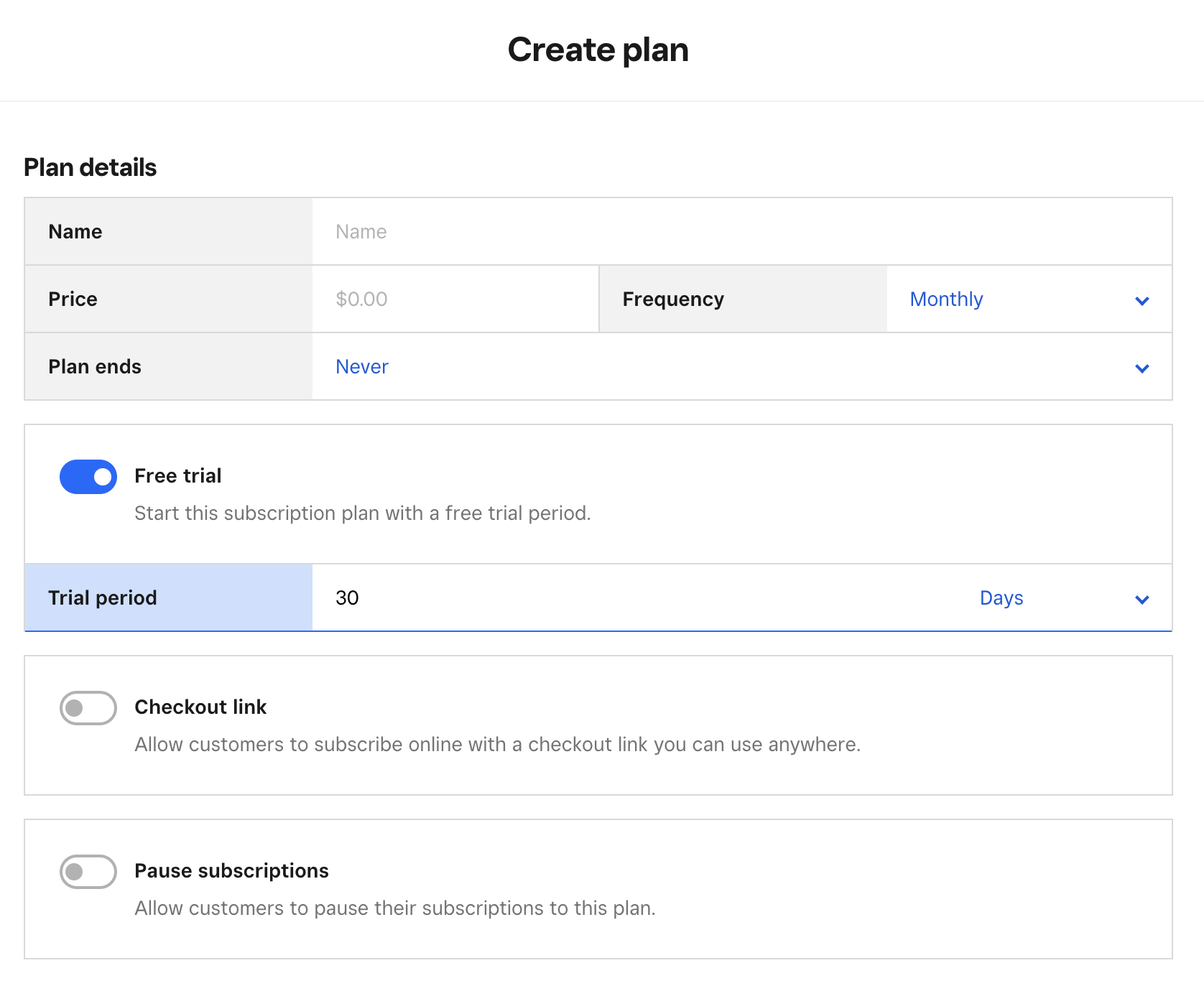 Right now, promotions can't be applied to subscription links, but you can create a free trial period when creating a subscription plan. Here's what this looks like: