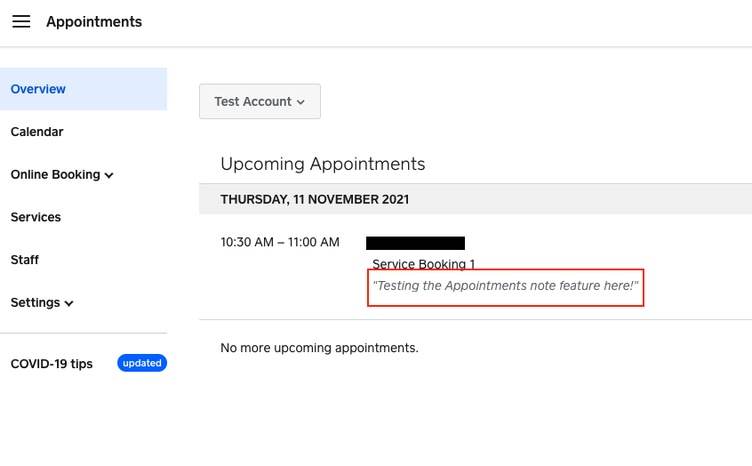 Thank you! It seems my customers can type a message directly to the salon when they initially book their appointment online.  I get no alert from it so I have to go into each client booking to check if they have left a ‘note from client’. I hope that makes sense!