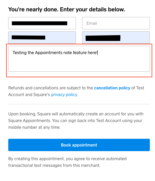 I went through the process of booking an appointment online and your customers are able to leave you a custom note as part of booking the appointment online: