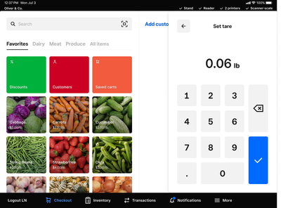 After you place an item on your connected scale and select it to add to cart, you’ll see an option to Set tare. You can enter the container’s tare weight that will be subtracted from the scale’s measured weight. Once the tare is set, and the item is added, the cart will then display the net weight used to calculate the price.
