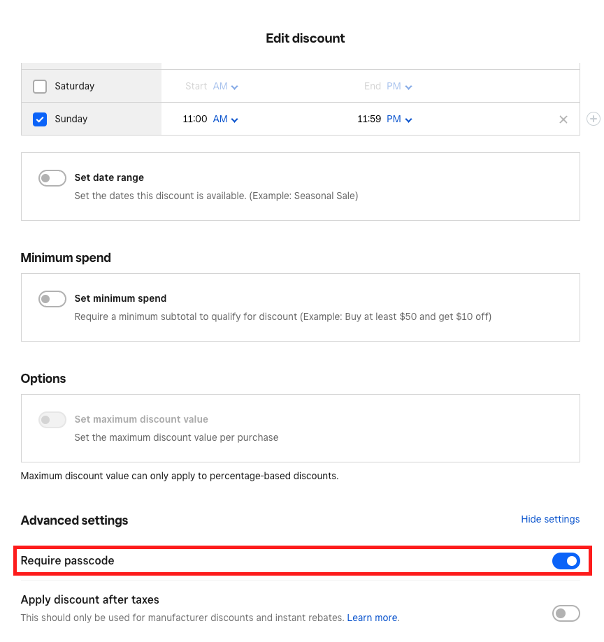 Discounts you create can be manually added to all sales, including automatic discounts. To prevent the manual addition of automatic discounts at the point of sale, you can require a passcode. The passcode is only prompted when a user attempts to manually add a discount outside of the automatic discount rules. Eligible purchases will still receive the automatic discount.
