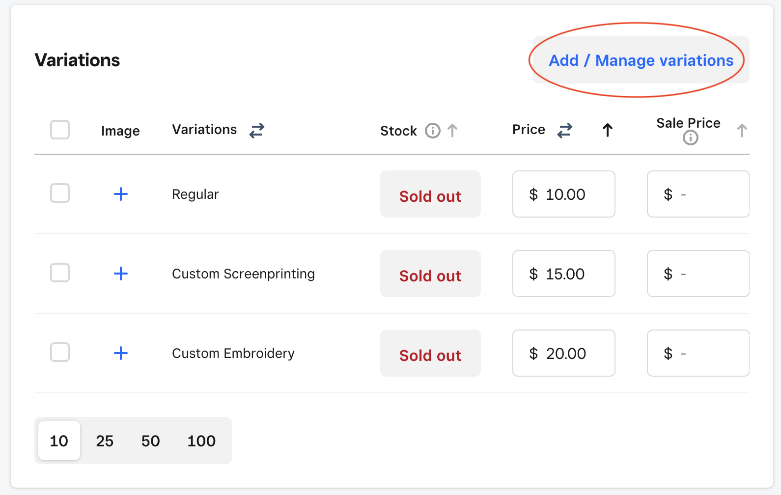 3. Enter the names of your variations and the corresponding prices for the item.