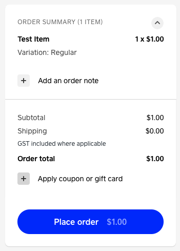 A coupon code can be entered upon checkout by pressing the "+" next to "Apply coupon or gift card":