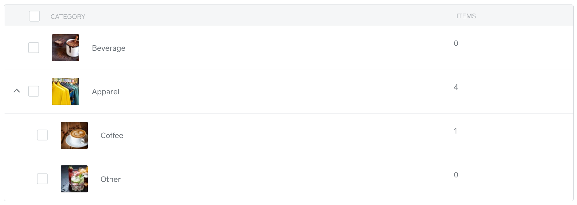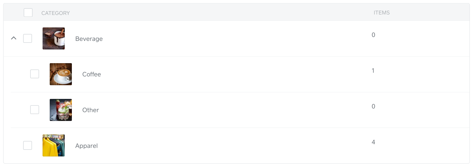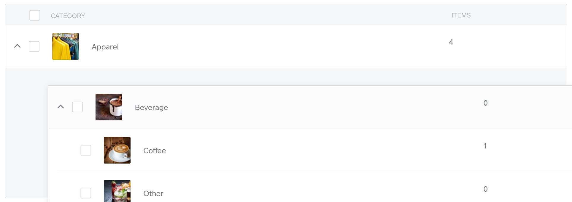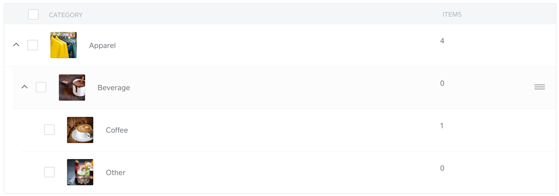 You can do the same thing with individual items within categories as well! Just click & drag to move items from one category into another - in this example I moved Coffee and Other from the Beverage category to the Apparel category: