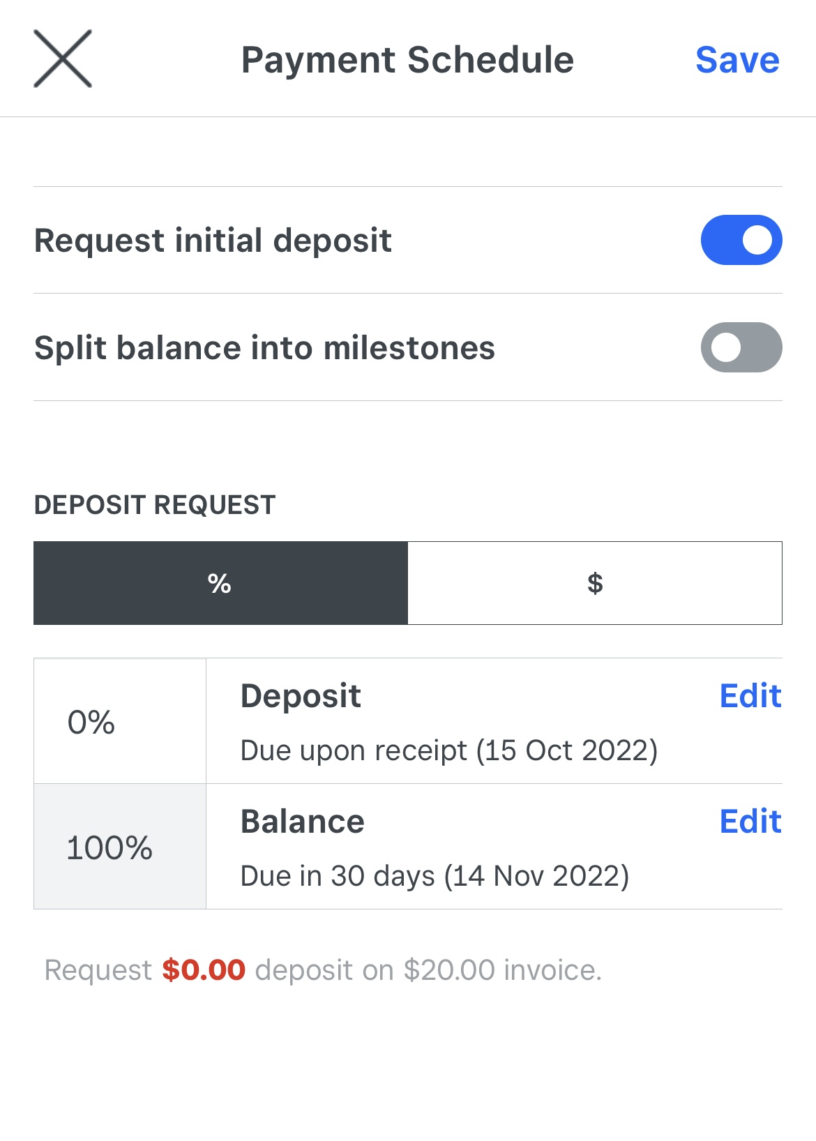 To create an invoice in-app, tap More > Invoices > Create Invoice. Next, add the customer, and item(s). Once you've done this, select + Add Payment Schedule and toggle request initial deposit on. You can opt for a dollar amount, or percentage-based initial deposit set a due date from here. The due date is adjustable as well.