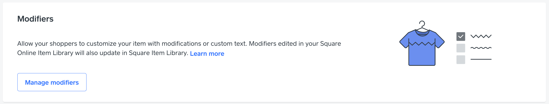 You'll start by editing your item through the Item Library within your Online overview page, then scroll until you see the Modifiers section of the Edit/Add Item page: