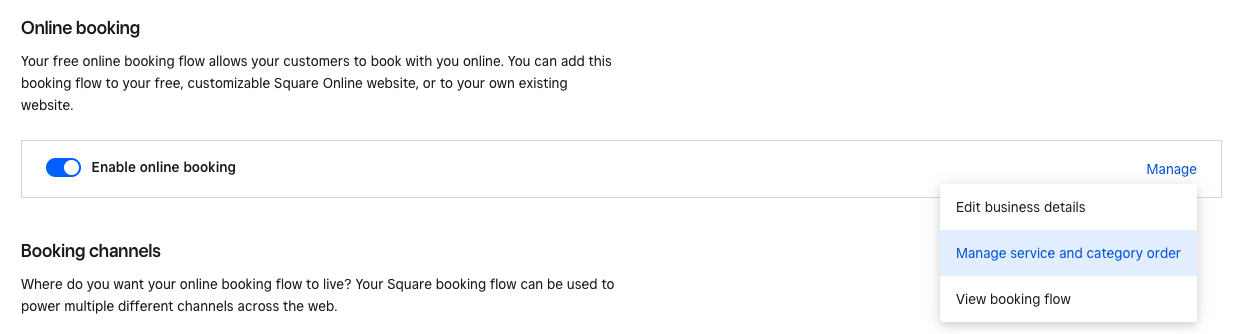 Go to Appointments > Online Booking > Channels > Under Online Booking click Manage > Manage service and category order.
