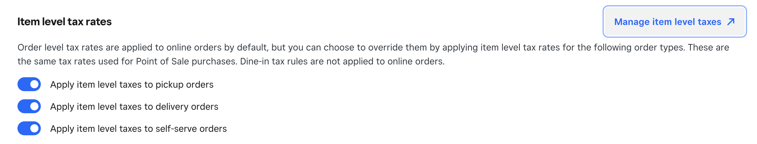 You can use the itemized tax rates in your online Square Dashboard for pickup and delivery orders through Square Online. To turn on itemized taxes for pickup and delivery orders: