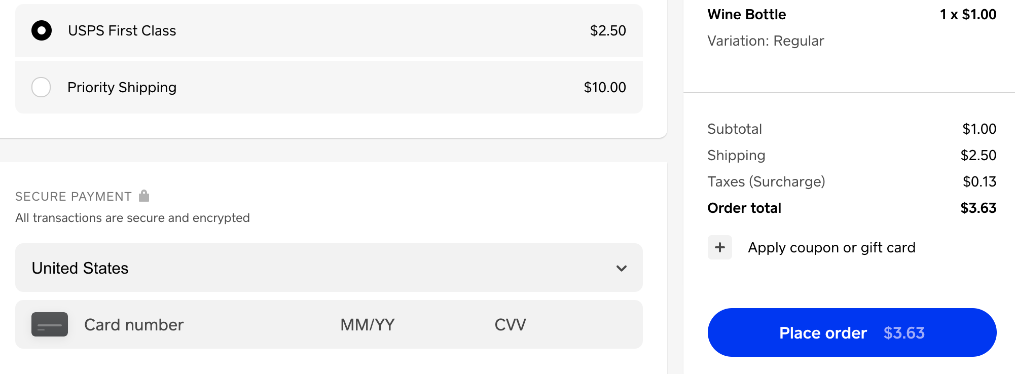 This order example from the checkout page shows that only two rules apply, allowing the customer to choose the shipping rate they prefer to pay. If the cart totaled more than $100, you would also see an option for free shipping.