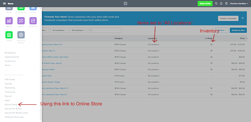 This is what I'm seeing- first, on my Square dashboard, my products (the events) are listed as available at all locations, with inventory. There's a link to the Online Store: