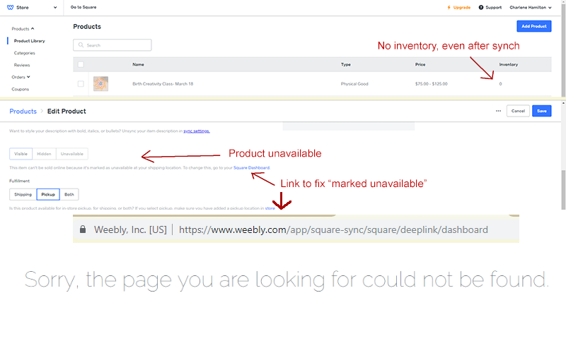 There, I can see that my products have no inventory, and when I click on the individual items, I see the "Marked as unavailable" message, and no inventory. The link doesn't go back to Square: