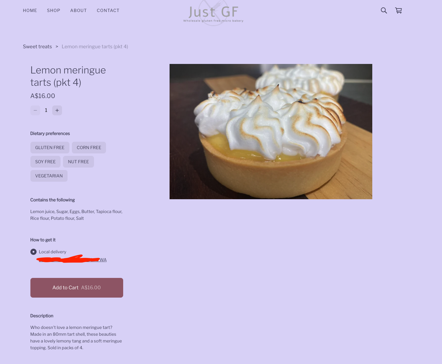 And thanks for noting the address entry step (of course!), sorry to have missed this when initially testing on my end. I've entered in a valid WA address and can now see the item price showing correctly on your Lemon meringue tarts item. See the screenshot below.
