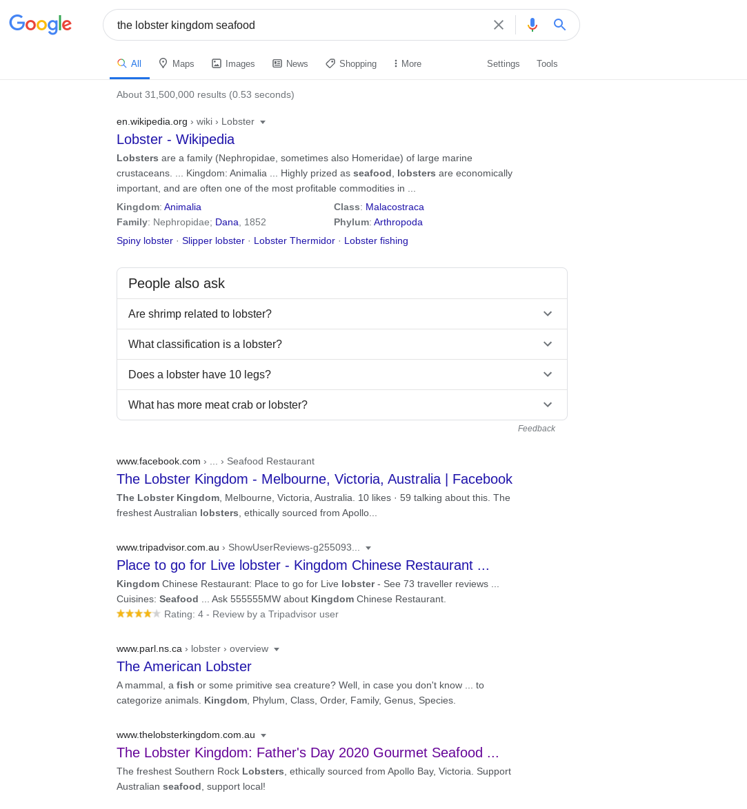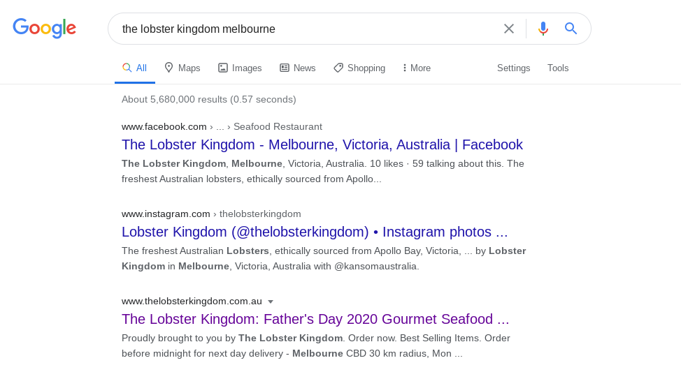 Meanwhile "The Lobster Kingdom Melbourne" gave your website as the 3rd result, after FB and Instagram. I wouldn't be too worried, it looks like SEO is doing it's job - you've just got to think about what your customers would be looking for to get a gauge on how well it's working 🙂