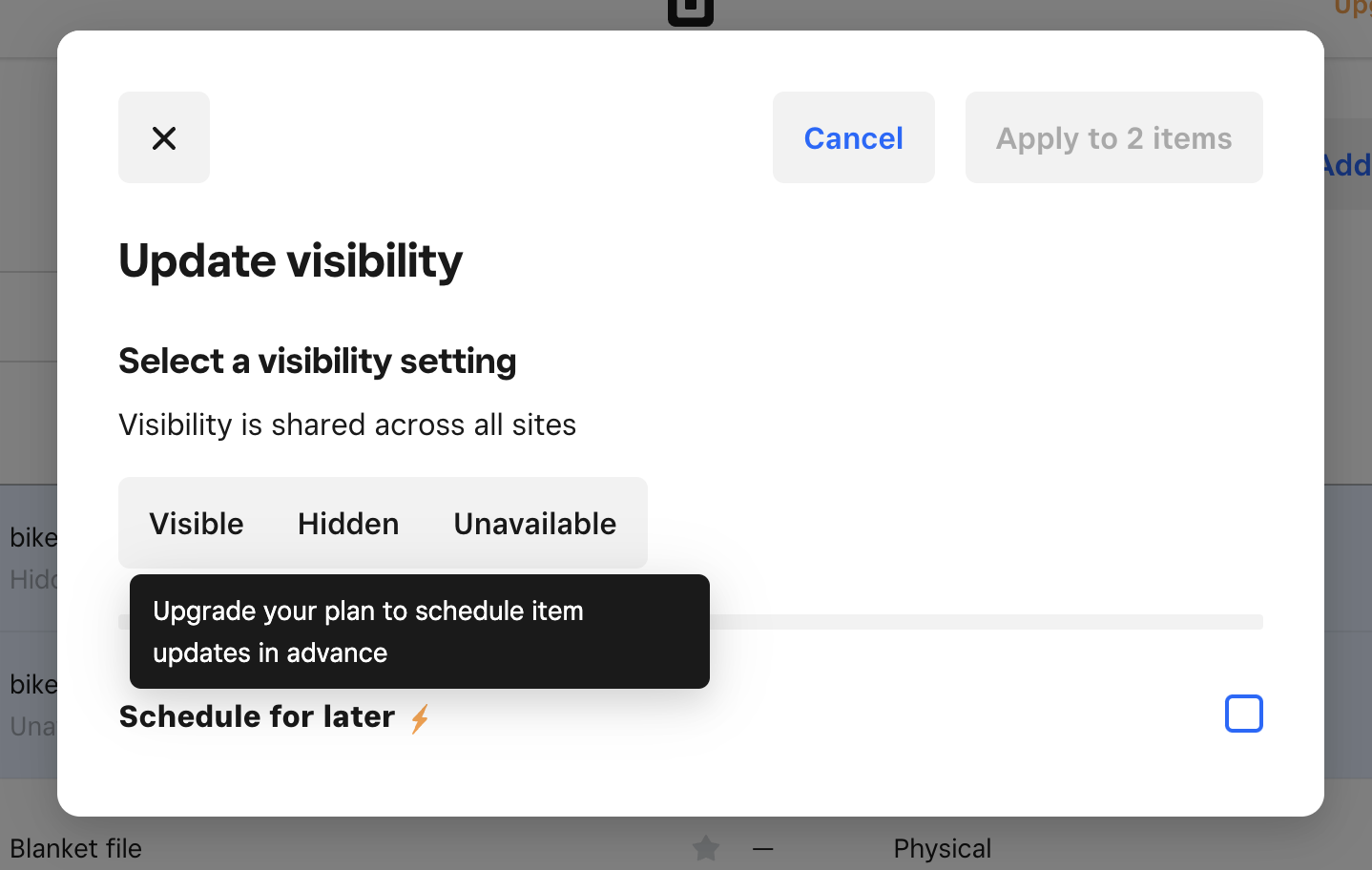 You can bulk edit your items by first navigating to the Square Online dashboard, then click Item > Site Items. Check the box next to the items you wish to edit, then click Bulk Edit in the top right corner. I believe you are looking for the Update Visibility option which will quickly mark all checked items as Visible, Hidden, or Unavailable. You can also schedule the visibility for a future date if you are on an upgraded plan.