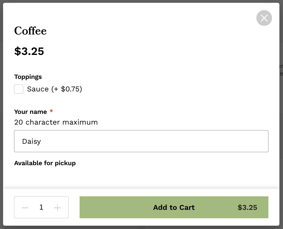 I've included some screenshots below of what this will look like when saved, just to confirm that you are looking for the text box in the correct spots. When a customer clicks on an item with a text box modifier, they will see a pop-up that looks like this (red asterisk if you choose to make the text box a required field) :