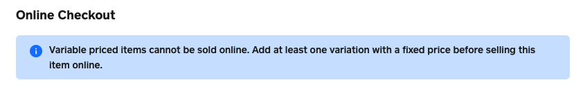 Thanks for reaching out. At the moment Square online doesn't actually support variably priced items. If you go into the item's listing via your Square Dashboard Inventory, you should see this notification: