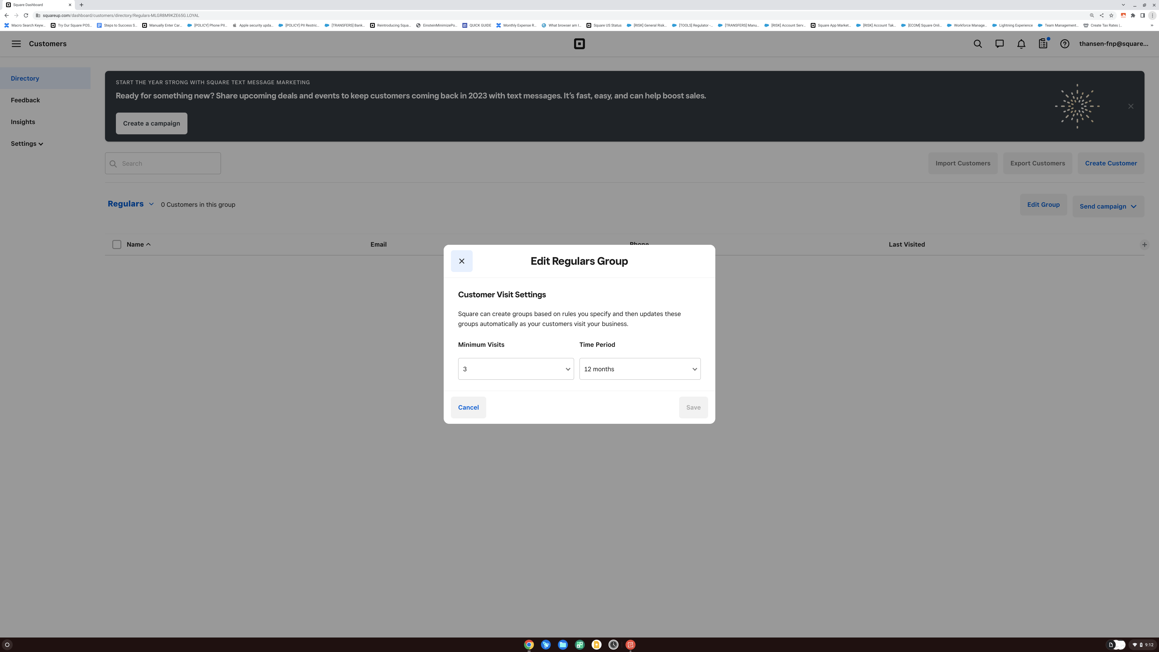 Alright thanks again for hanging in there, @TJ2 you can change the settings in the "Regular" customer group, make it for one visit, and even change the time period. To do this go to Customers>Directory>Select Regulars in the drop-down menu>Edit Group, and a box will come up to adjust customer visit Settings. I am including a screenshot as well.