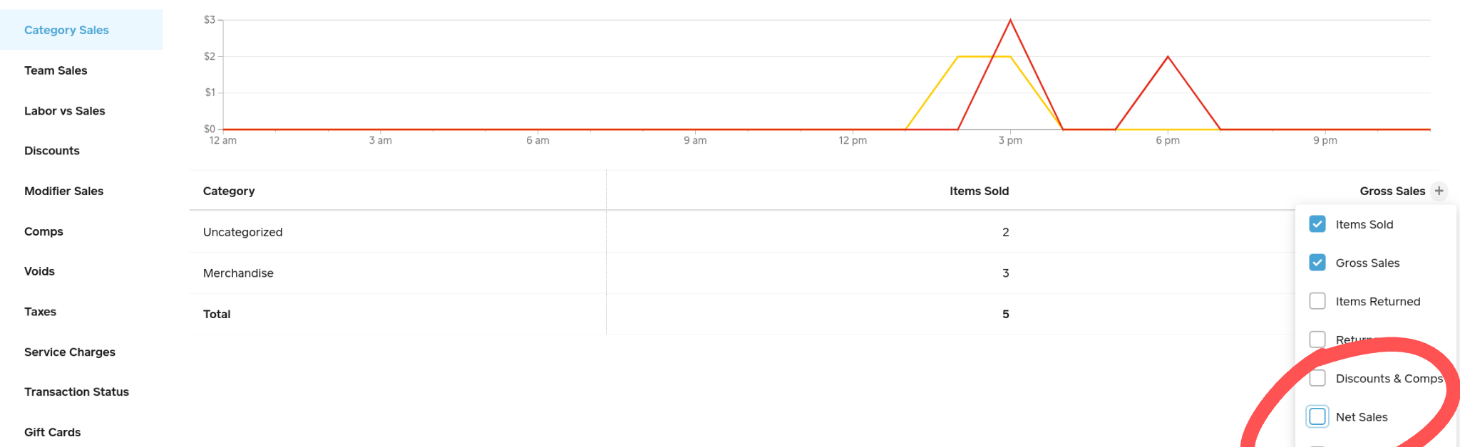 Most of the Reports on the Square dashboard have a + button on the header line that lets you customize the fields that display on the report. The Category report for instance has the ability to show Items Returned, Returns, Discounts and Comps, Net Sales, etc. as columns. Hope this helps!