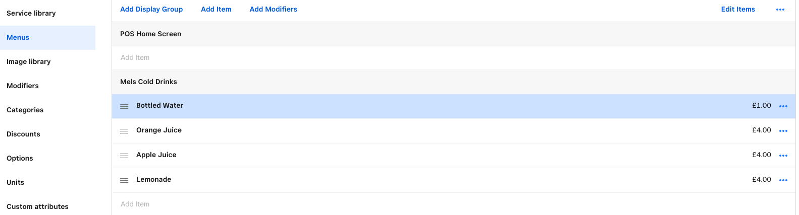What you’ll find is that your pre-existing Item Library and Categories are still available as you’ll see from the screenshot above, but your Point of Sale menu will be organized in Display Groups.