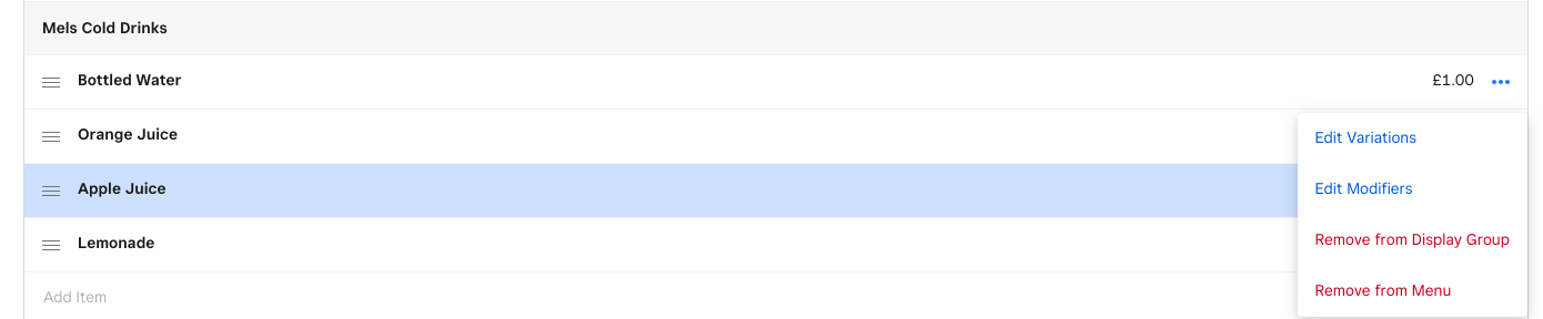 When viewing your Menu, you can use the 3 horizontal lines to the left of the Items, if you’d like to rearrange the order in which they’re displayed within the group - just drag & drop.