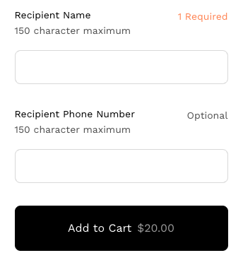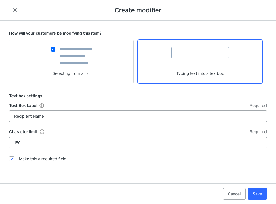 You'd then repeat those steps for the second text box for the recipient's phone number. These modifiers can then be added to all items they're applicable to, and this is what this would look like on the item: