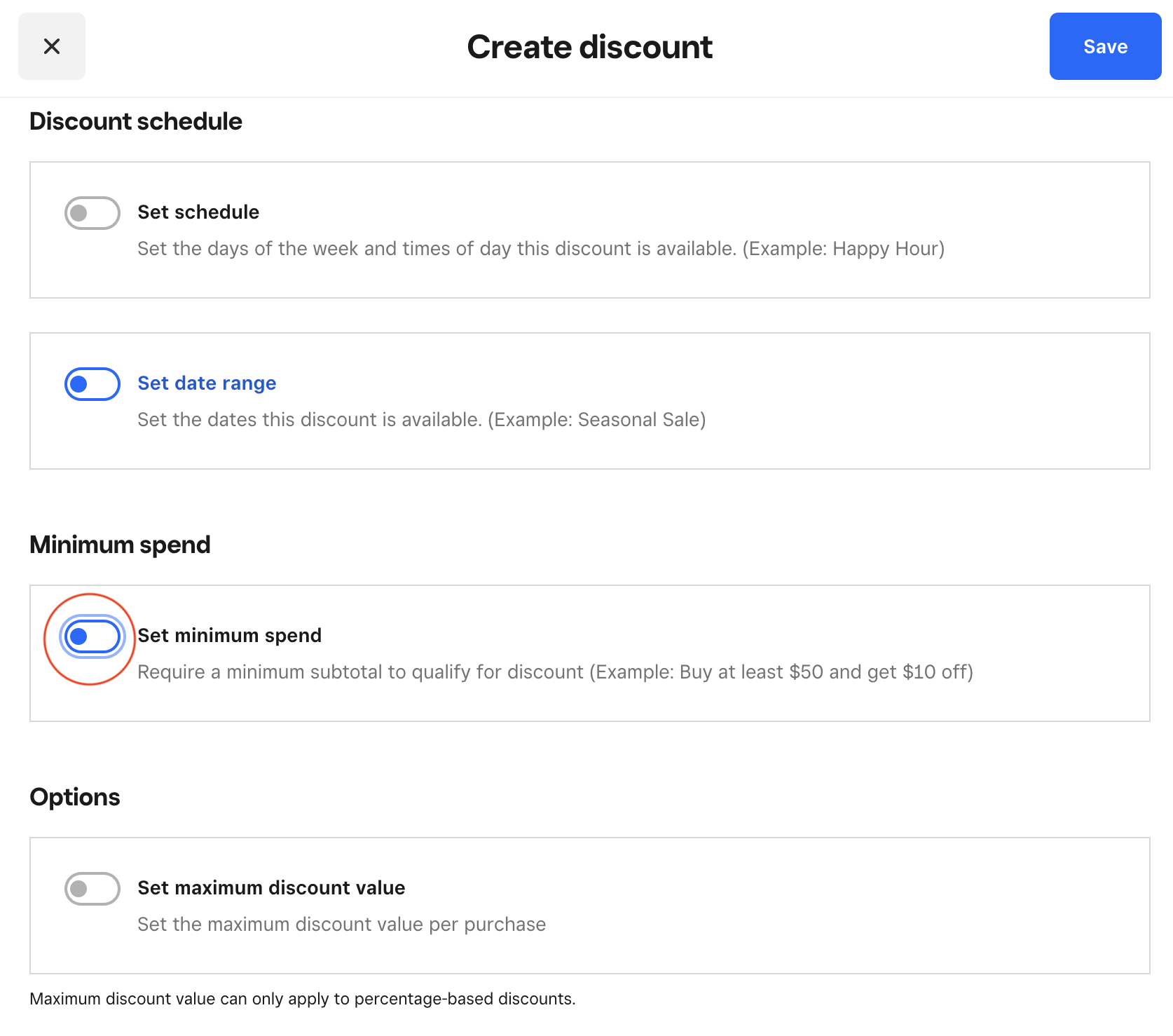 You can apply a minimum spend to existing, or new discounts, @SarahMarsh, when Discount Rules is toggled on. Head to Items > Discounts in your Dashboard and select either an existing discount, or create a new one. Next, toggle on Discount Rules and scroll to Minimum Spend