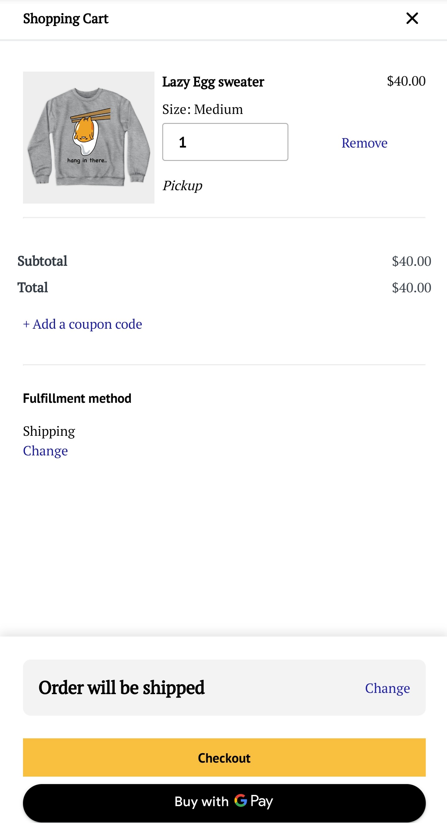 This is the important part: The coupon needs to be entered on the initial checkout screen before they continue to the final checkout page. If the coupon in entered on the final checkout screen, the free shipping option will not be visible - unless they go back to the website, and get back to that first checkout screen. Whether you're viewing the mobile or desktop version of your website, the initial screen looks like the screenshot below (on mobile, it will fill the screen of a phone - on a desktop, it will pop out from the right-hand side of the screen) :