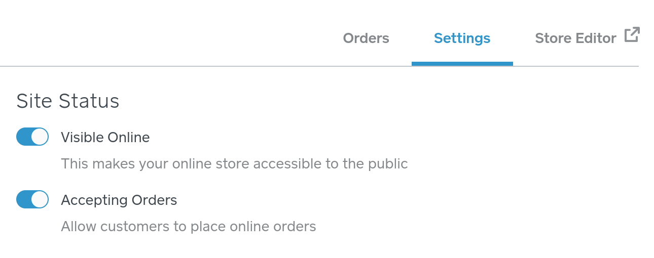 Once you're here, click on the original link to head over to the editor for the old online store. Click on Settings in the top right-hand corner, and you should see your Site Status options in the top right-hand corner. If the Visible Online and Accepting Orders options are currently toggled on, go ahead and toggle these options off.