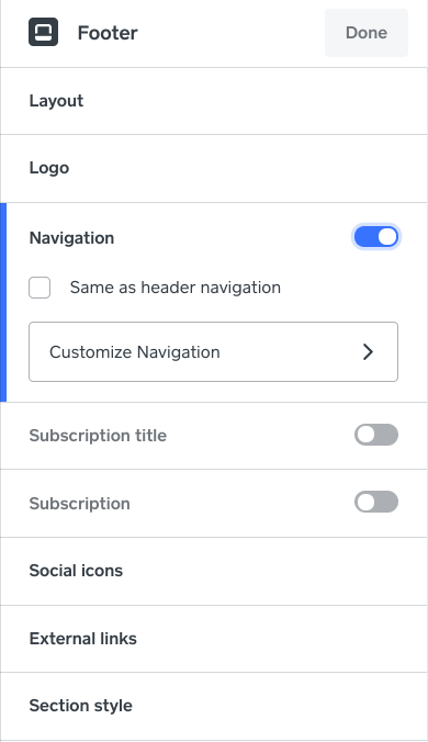 4. Here, you can toggle the Navigation to blue. Since you don't want the link to be at the top menu bar, make sure to untick "Same as header navigation"